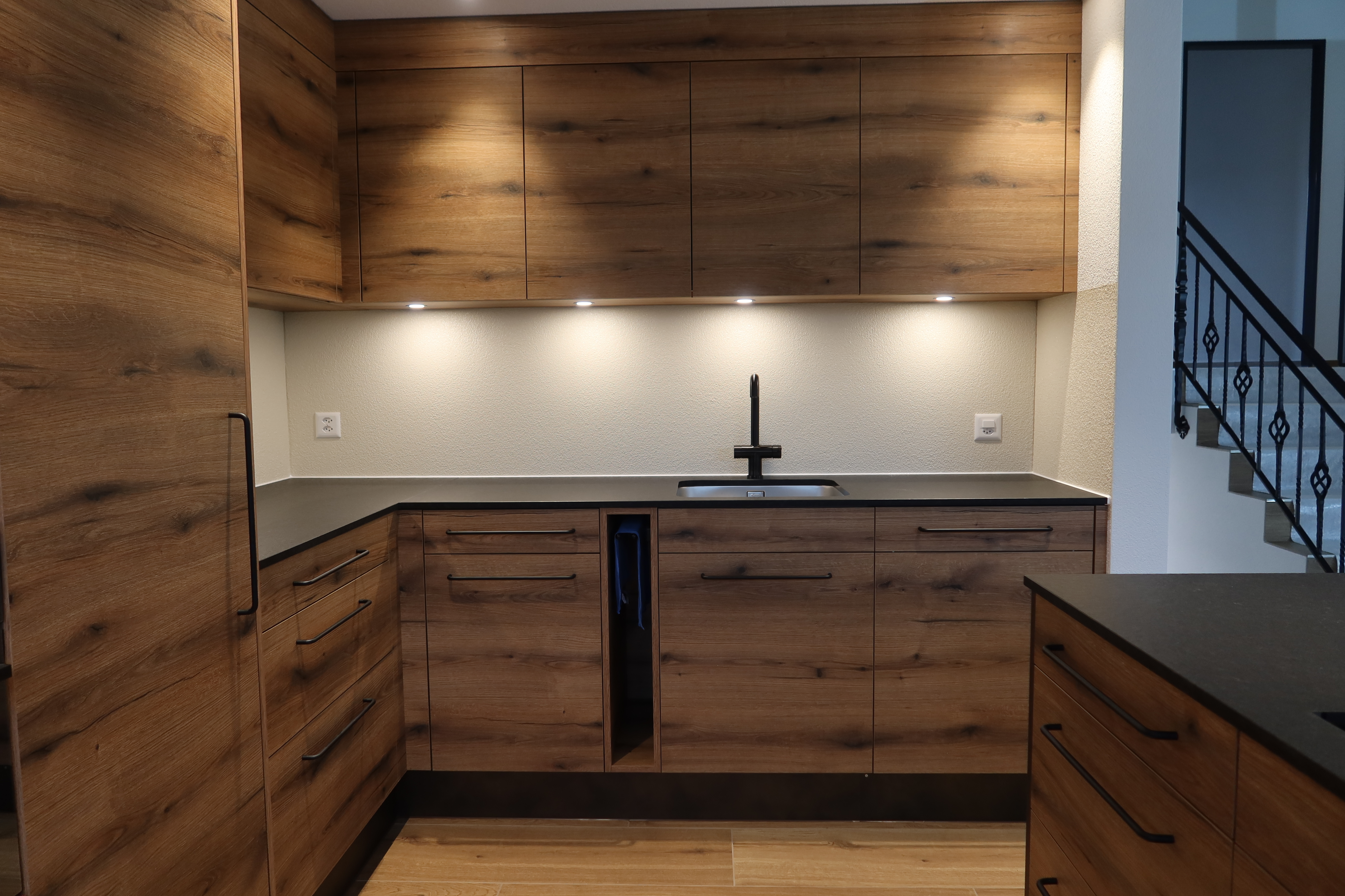 Durch das Öffnen des Wohnraumes wurde mehr Platz geschaffen. Mehr Arbeitsfläche, mehr Stauraum und ein offenes Wohngefühl wahren das Resultat. Schwarze Griffe und Armaturen ergeben mit dem klassischen Holz und Stein ein modernes Aussehen. Unsere Arbeiten: Beratung, Planung, Produktion und Montage